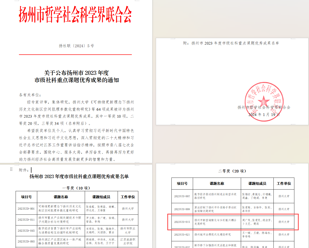 市社科联公布了扬州市 2023年度市级社科重点课题结项项目及优秀项目,我处周广茂申报的课题《扬州市新型城镇化与乡村振兴耦合发展研究》获优秀成果二等奖。
