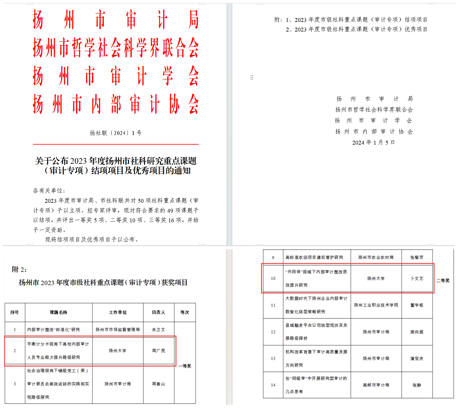 研究促发展,课题喜丰收。近日,市审计局、市社科联联合公布了扬州市2023年度社科研究重点课题(审计专项)结项项目及优秀项目,我处周广茂申报的课题《平衡计分卡视角下高校内部审计人员专业能力提升路径研究》获优秀成果一等奖、卜文艺申报的课题《“共同体”视域下内部审计整改质效提升研究》获优秀成果二等奖。