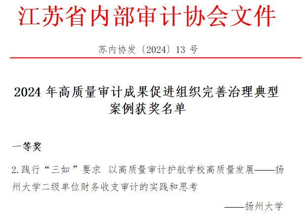 其中,我处选送的实践案例《践行“三如”要求 以高质量审计护航学校高质量发展—扬州大学二级单位财务收支审计的实践和思考》荣获一等奖,全省仅一家高校获此殊荣;理论研讨《以研究型审计助力高校内部审计发挥“三如”作用》《高校内部审计监督与其他监督协同机制研究——基于新“三线模型”》荣获二等奖、三等奖。